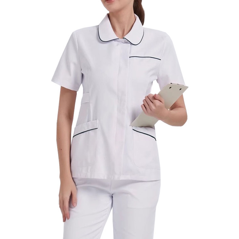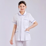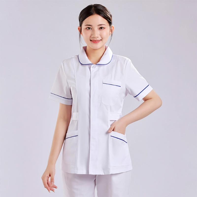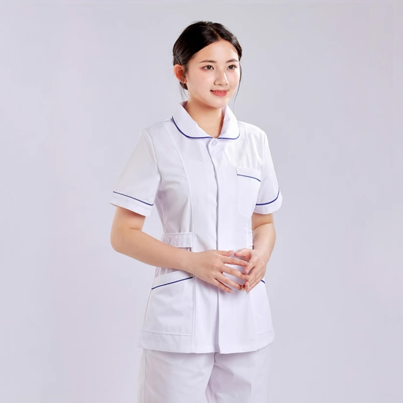 醫院護士工作服,短袖手術服,白色與藍色裝飾邊,多口袋設計,耐用且易於護理的材質