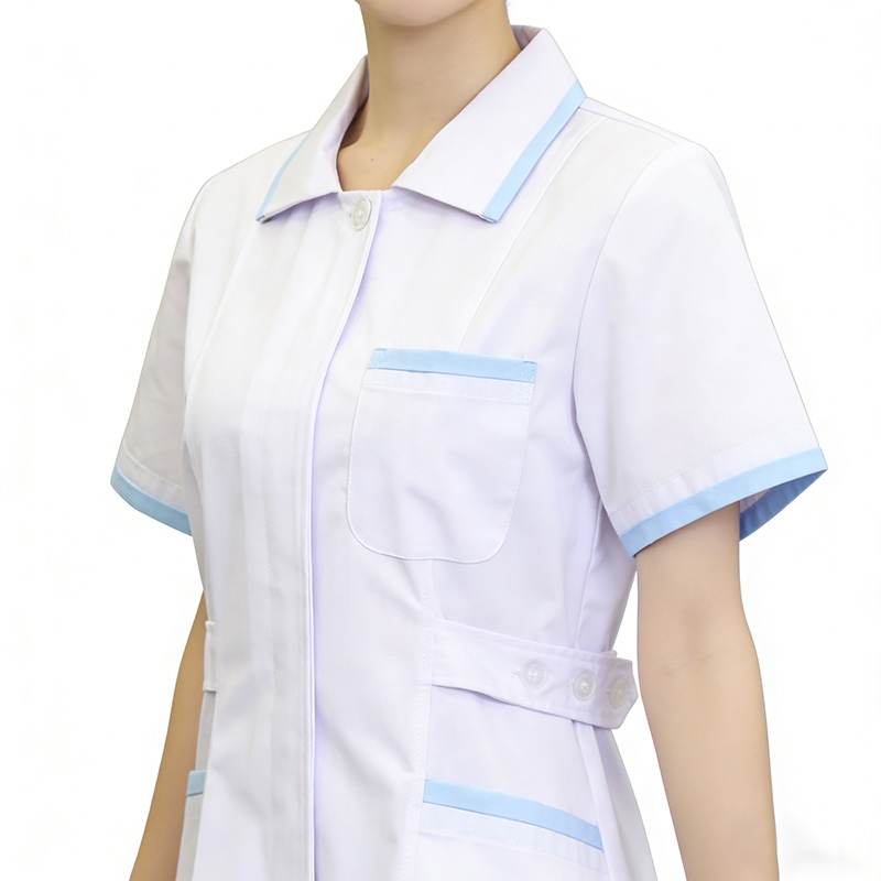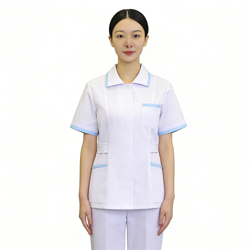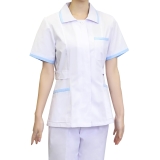 醫院護士工作服,短袖手術服,白色與藍色裝飾邊,多口袋設計,耐用且易於護理的材質