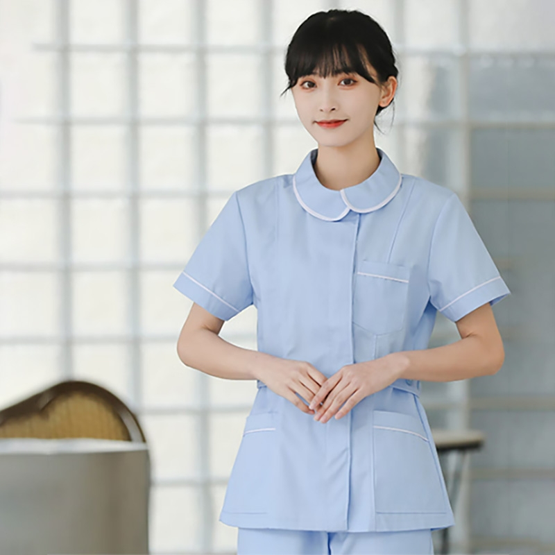 女款醫護工作服,淺藍色短袖帶白邊護理衣服,舒適透氣醫院老人院護理制服套裝