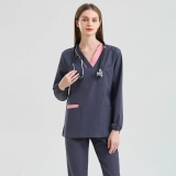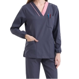 女式醫護工作服長袖,彈力羅紋袖口V領撞色,多隔層口袋服裝兩件套