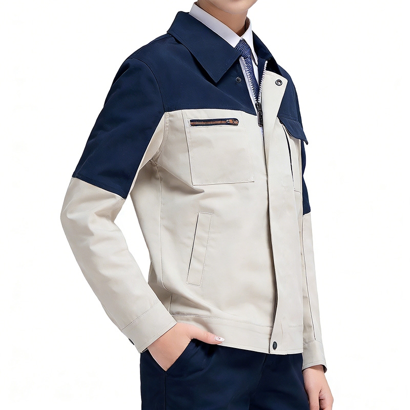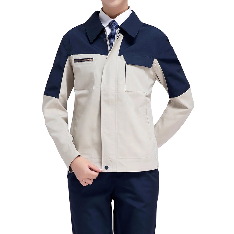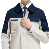 企業團隊定製工裝 藏青拼米白雙開襟工裝上衣