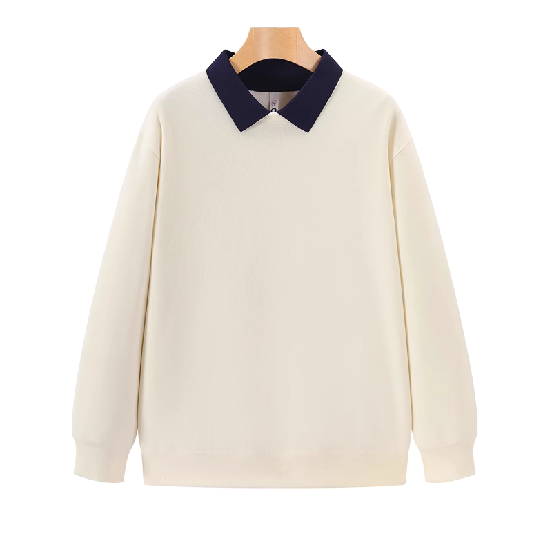 女士米白色撞色翻領長袖上衣,簡約棉質基礎打底衫,春秋季百搭款