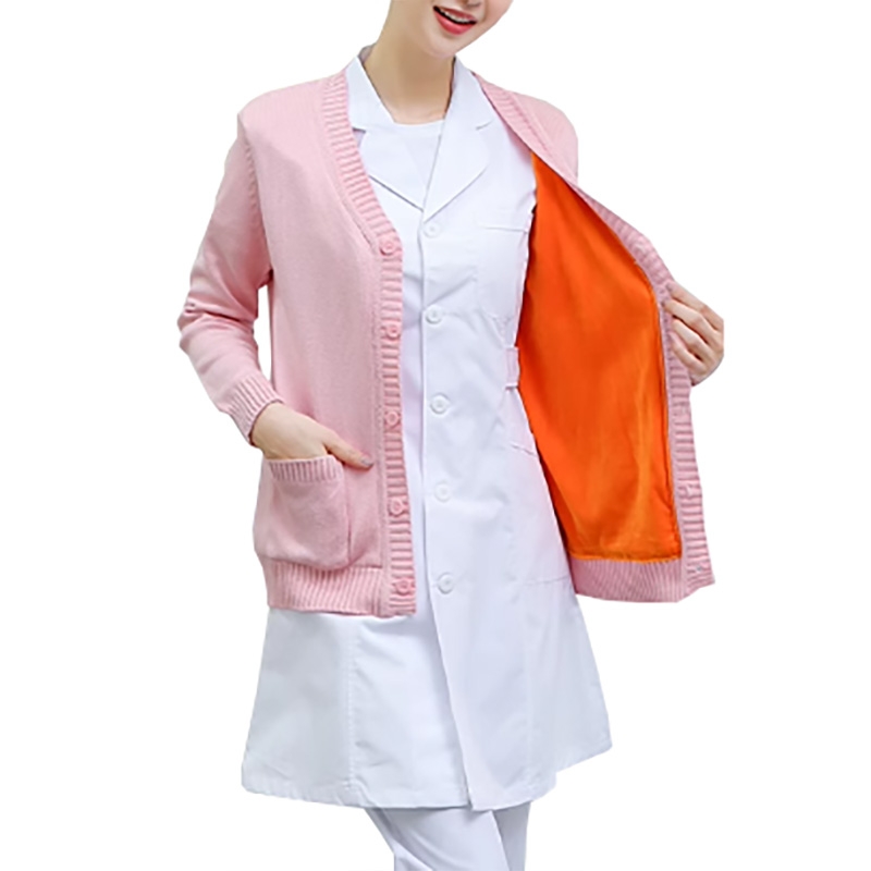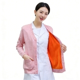 這是一款粉色加絨醫護專用針織開衫,是兼具保暖性與親和力的醫護人員值班外套。