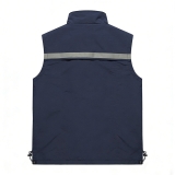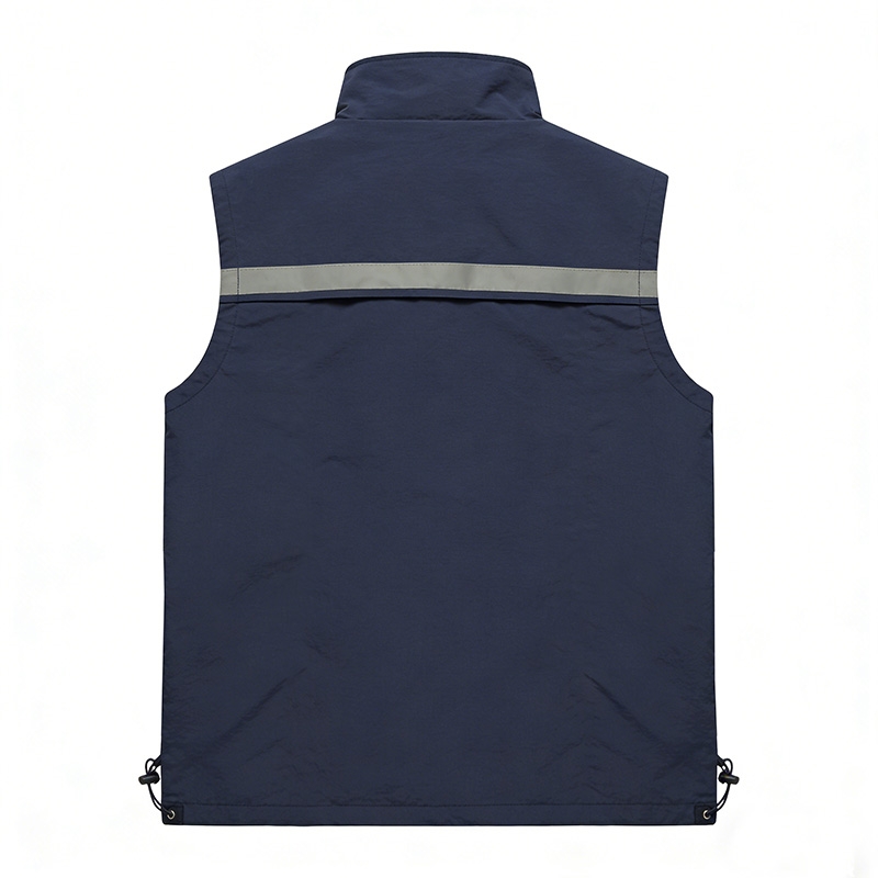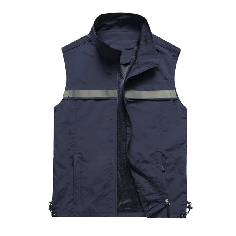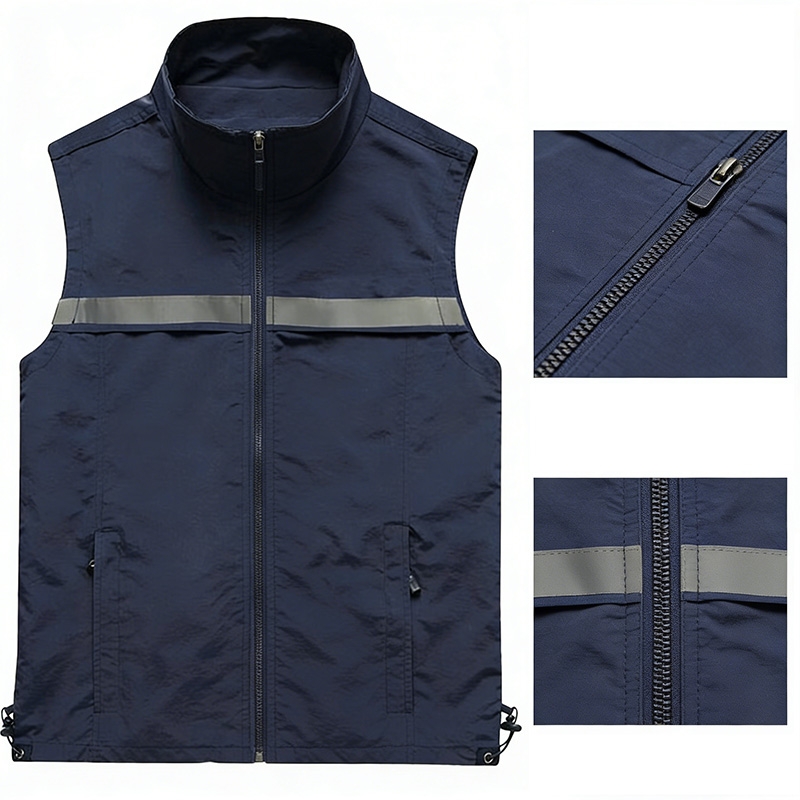 設計風格:採用沉穩的藏青色主體 + 胸前橫向反光條設計,立領 + 拉鏈開合,無袖版型簡約利落,風格低調且富有功能性,適配戶外工作、夜間執勤、物流配送等場景。