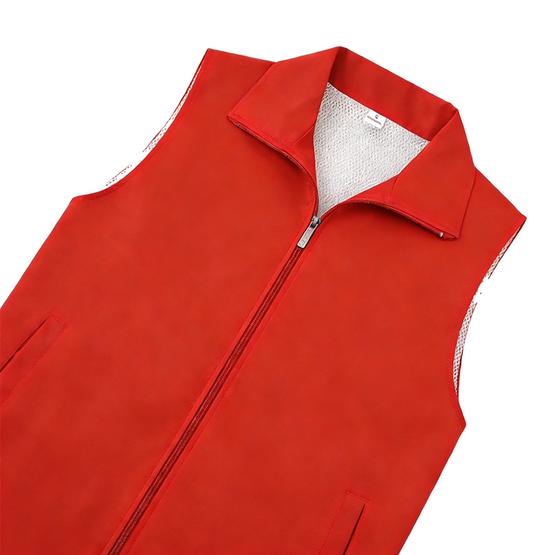 設計風格:採用高飽和度的正紅色主體,翻領 + 拉鏈開合,無袖版型簡約利落,風格醒目且富有親和力,適配公益活動、社區服務、展會接待等場景。