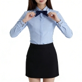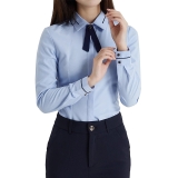這是一件淺藍色尖領裝飾領結襯衫,是兼具精緻感與專業感的職場及服務業必備單品。
