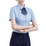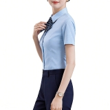 設計風格:採用柔和的淺藍色底 + 細白條紋,尖領 + 單排扣設計,搭配可拆卸條紋領結,短袖版型簡約利落,風格專業且富有辨識度,適配金融、航空、酒店等服務業場景。