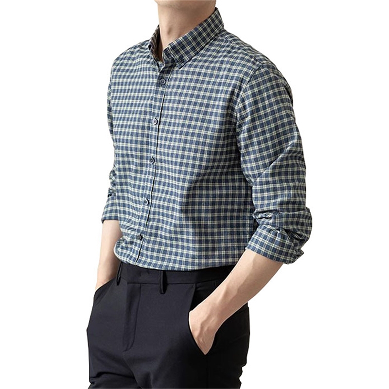 英倫風復古藍白格紋長袖襯衫 休閒修身版型 爲男士打造的日常休閒服裝