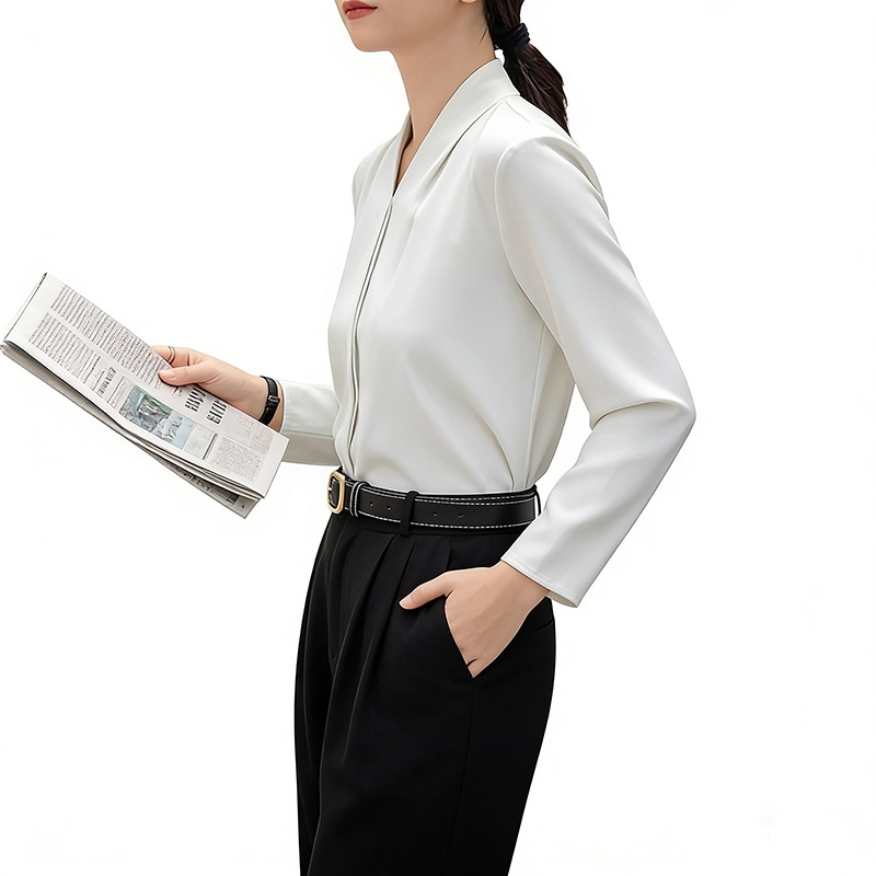 設計風格:採用經典純白色,V 領 + 暗門襟設計,寬鬆垂墜版型簡約利落,風格大氣柔和,適配職場通勤、商務休閒及日常穿搭場景。
