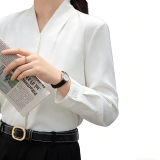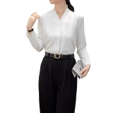 這是一件白色 V 領垂感襯衫,是兼具優雅感與適配性的職場及日常必備單品。