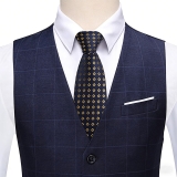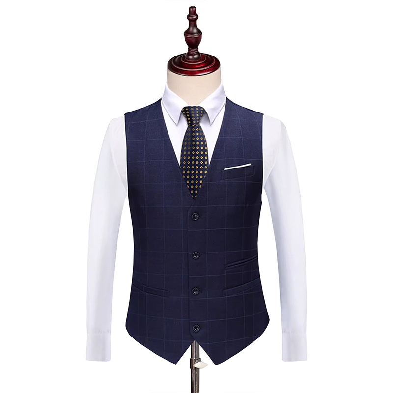 這是一件藏青格紋西裝馬甲,是兼具精緻感與實用性的職場及正式場合搭配單品。
