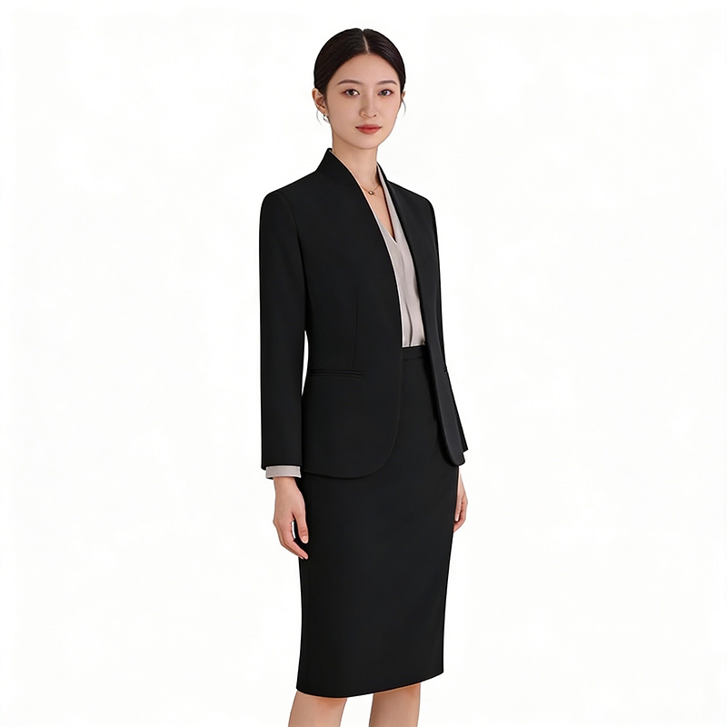 設計風格:採用經典純黑色,無領簡約外套搭配同色系及膝半裙,版型修身利落,風格大氣端莊,適配職場通勤、商務會議及輕正式社交場景。