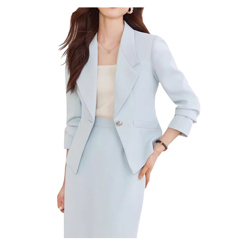 翻駁領中袖設計,短款修身淡藍色小西裝套裙