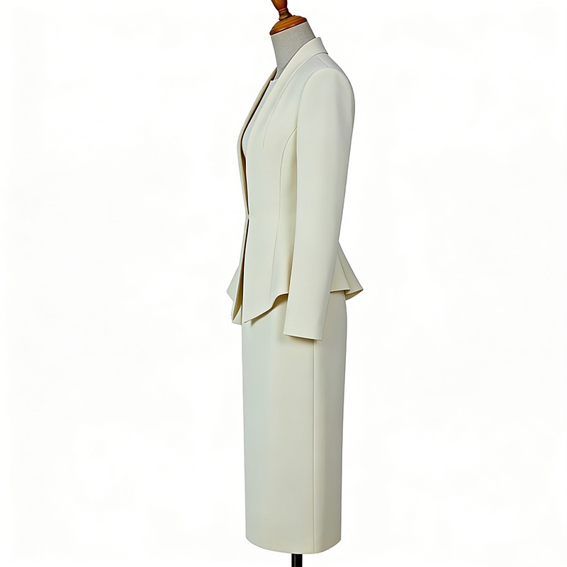 細節亮點:單扣收腰與荷葉邊下擺修飾身形比例,縱向視覺顯高顯瘦;直筒裙擺長度及踝,兼具端莊感與行動便利性;米白色比傳統深色更清爽,適配各類膚色與配飾組合,通用性強。