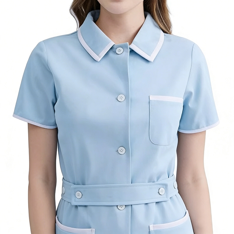 護理機構專業工作裙,夏季淺藍色醫護職業裝,娃娃領撞色短袖護士服