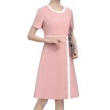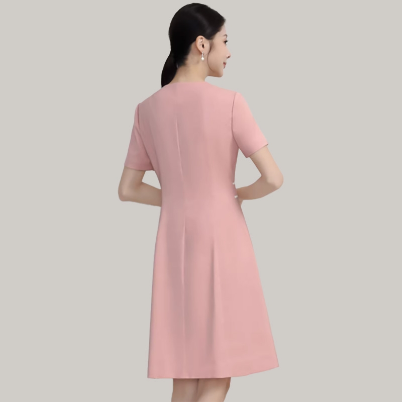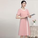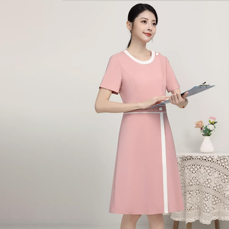夏季粉色護士服連衣裙,圓領短袖白邊裝飾,護理院美容院醫美工作制服