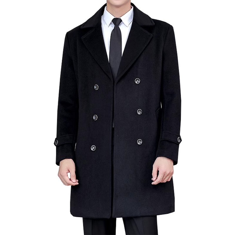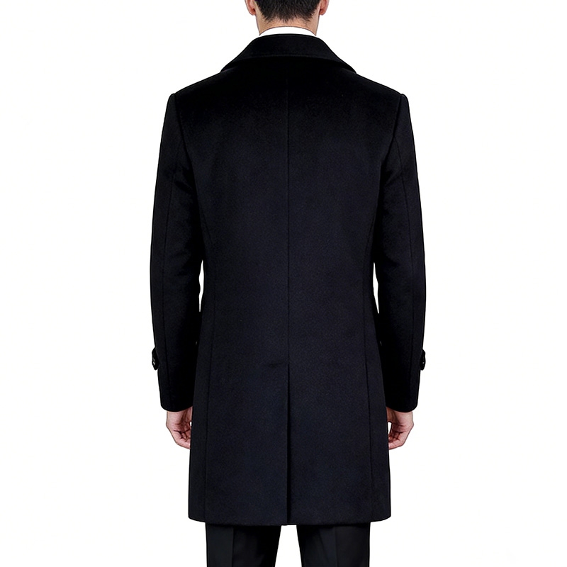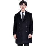 這是一件黑色雙排釦中長款男士毛呢大衣,是兼具經典感與正式感的秋冬通勤及商務場合必備單品。