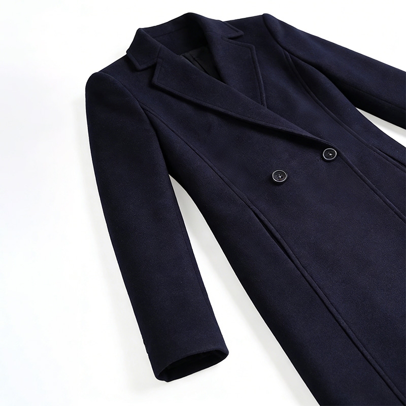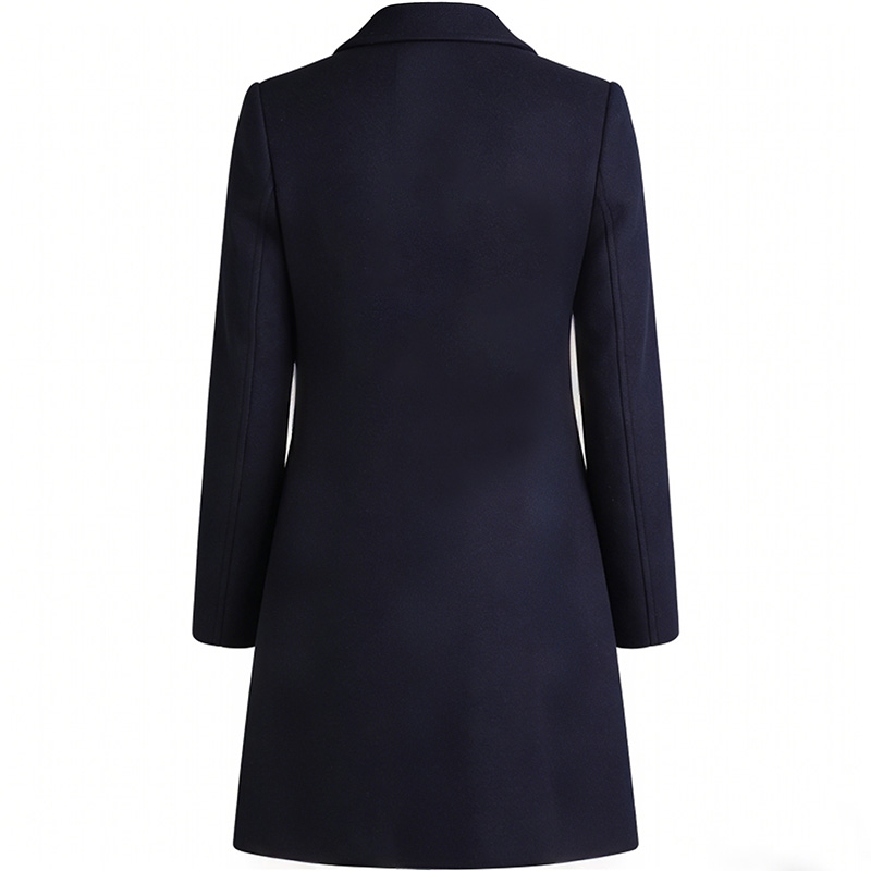 細節亮點:雙排釦設計增加服裝的層次感與正式感;西裝領設計可拉長頸部線條,搭配襯衫或高領毛衣時造型感更強;中長款版型可覆蓋臀部,提升保暖性與修飾身材效果;藏青色比黑色更柔和,適配各類膚色與內搭組合,通用性強。
