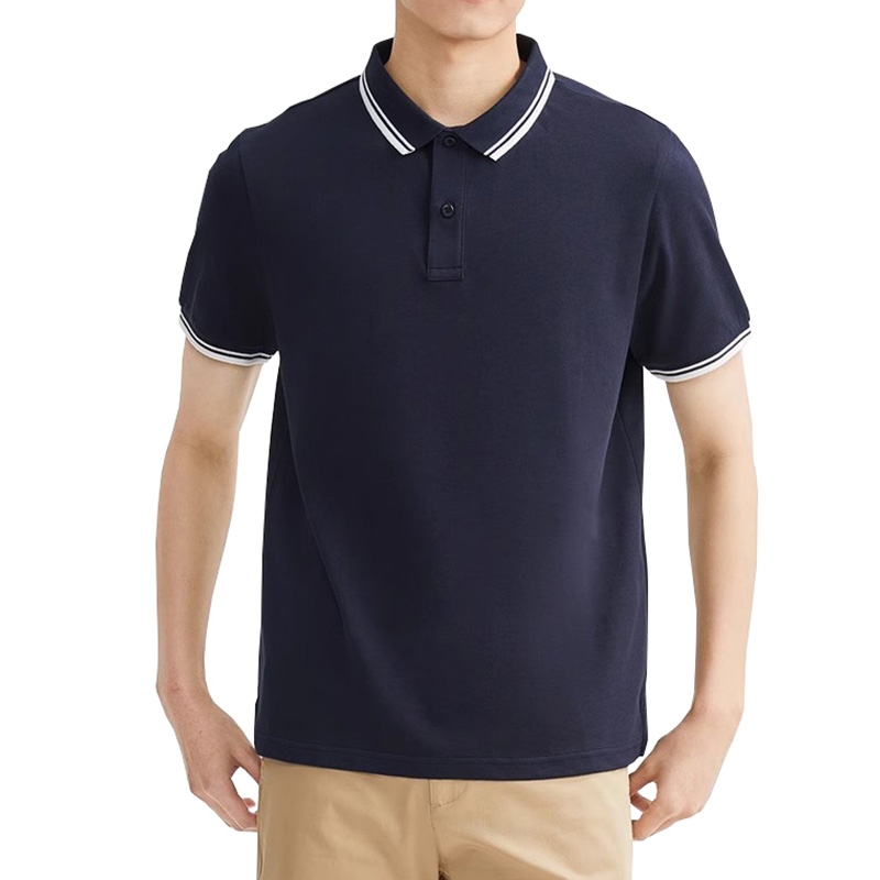 設計風格:採用沉穩的藏青色作為主體,搭配白色撞色包邊的翻領與袖口細節,版型修身利落,既保留了 Polo 衫的經典商務屬性,又通過撞色設計增添精緻層次,適配日常休閒與輕商務場景。