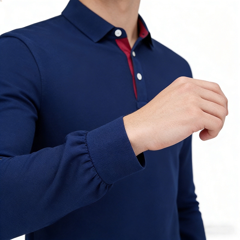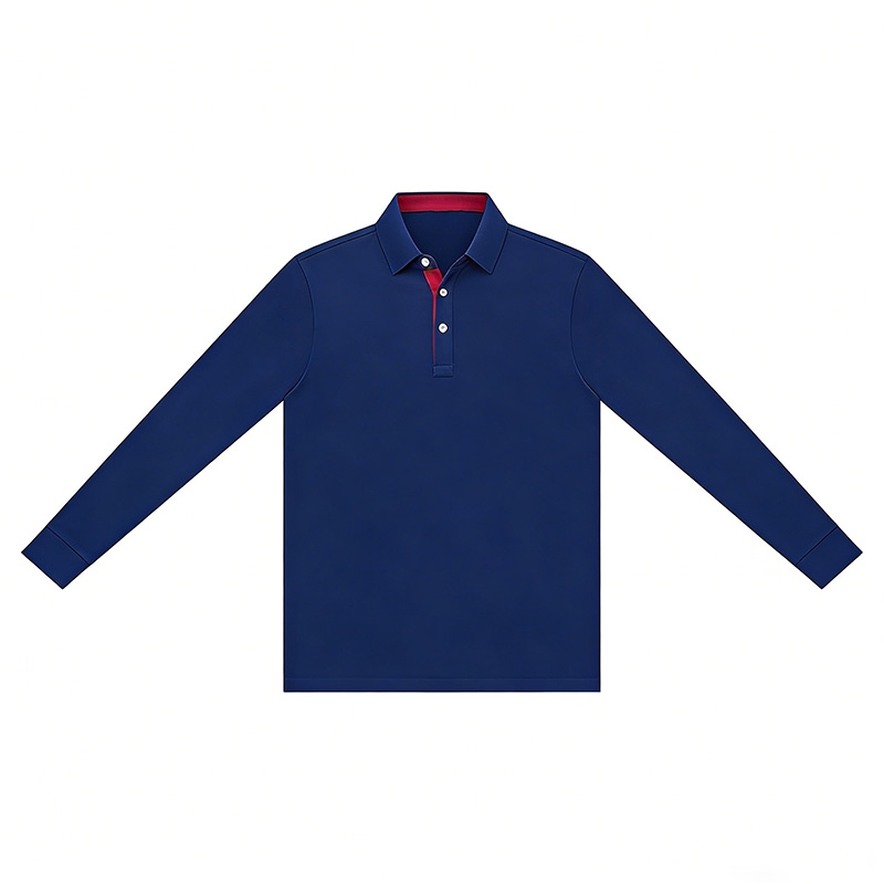 細節亮點:兩粒扣設計可靈活調節領口鬆緊,適配不同頸部圍度;長袖設計適配春秋季溫差,可單穿或作為內搭;撞色領內細節自帶視覺焦點,支援刺繡或印刷定制 Logo,適配團隊服、商務工裝等批量需求。