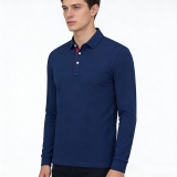 這是一款藏青撞色領長袖 Polo 衫,是兼具穩重感與精緻感的百搭單品。